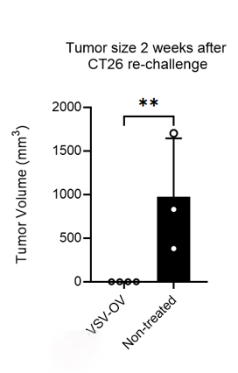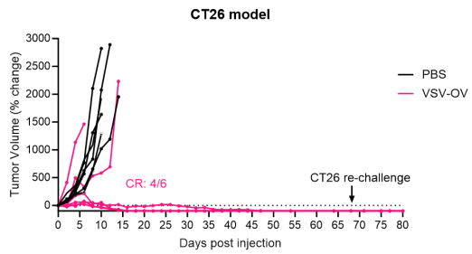利用CT26小鼠移植瘤模型,VSV OV给药治疗后,大部分小鼠达到完全缓解(CR),8周后re-challenge实验(在同一部位用同样数量的肿瘤细胞系进行荷瘤),暂未观察到CR小鼠再次长瘤(对照组小鼠荷瘤时年龄与VSV-OV给药组小鼠相匹配,为20周龄), 体现出持久免疫保护效果